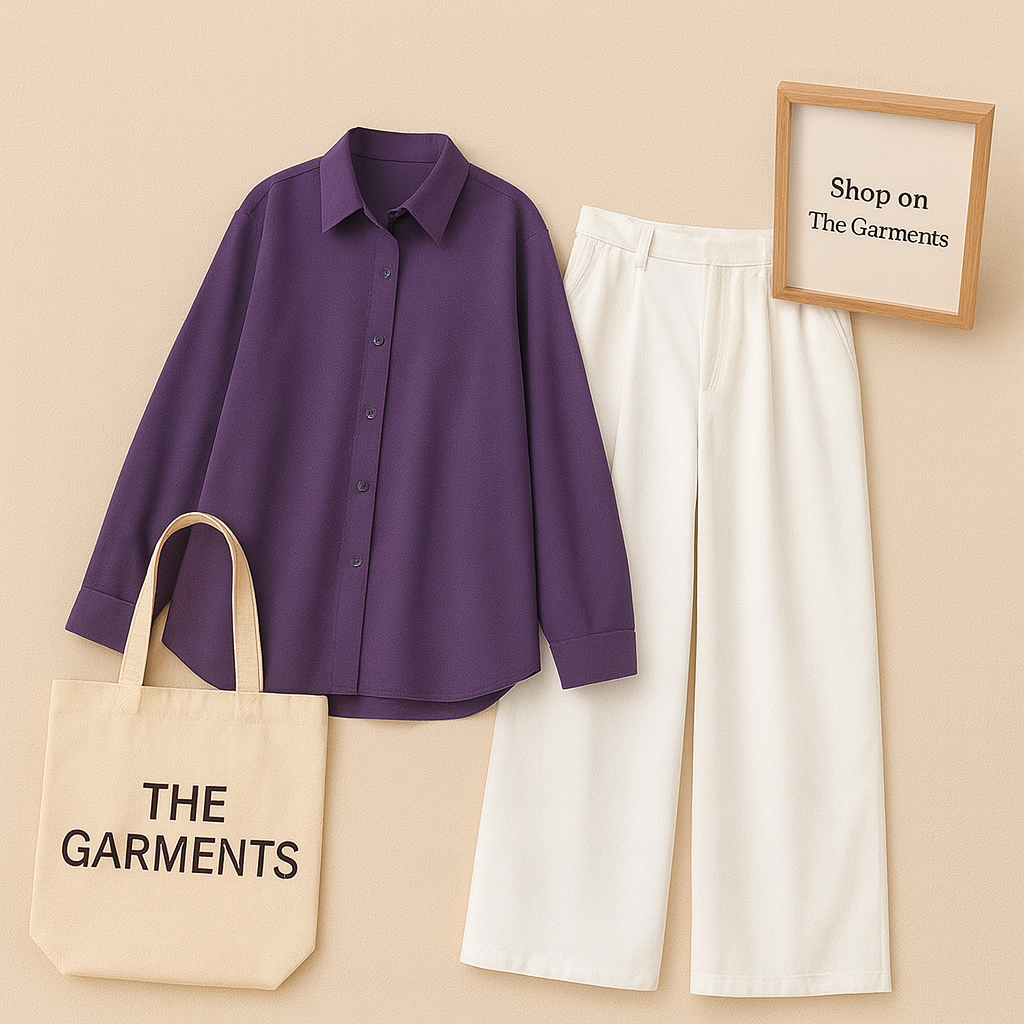 PURPLE BUTTON SHIRT WITH WHITE WIDE LEG JEANS