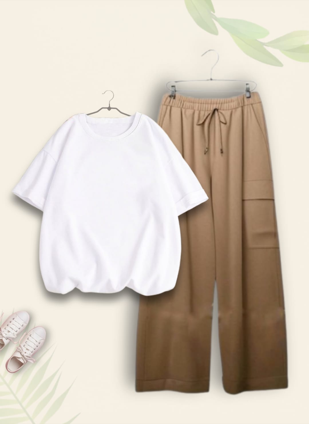 PLAIN WHITE TSHIRT WITH BEIGE CARGO TROUSER