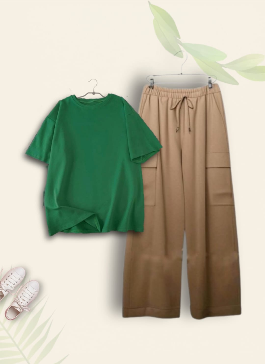 PLAIN BOTTLE GREEN TSHIRT WITH BEIGE CARGO TROUSER
