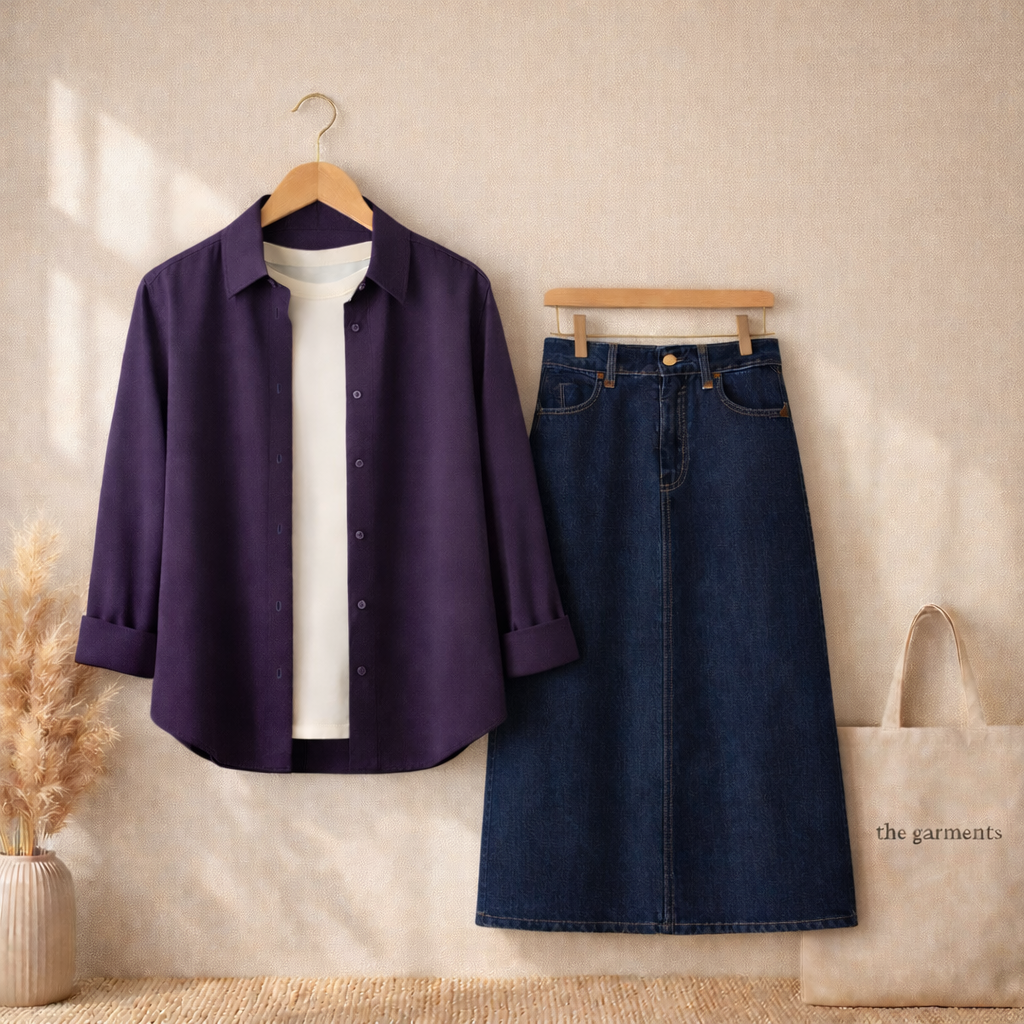 PURPLE BUTTON SHIRT WITH WHITE TSHIRT AND DARK BLUE SKIRT (3PCS)